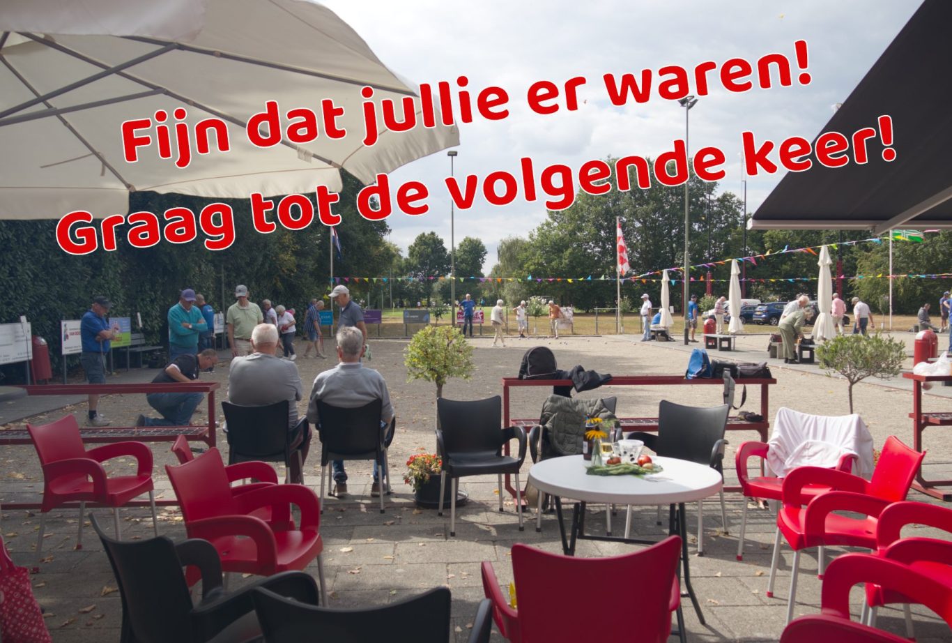 38 doublettes namen deel aan het jaarlijkse toernooi. Een gezellig aangekleed terrein, mooi weer en met deelnemers in een opperbeste stemming was het een fantastische dag!